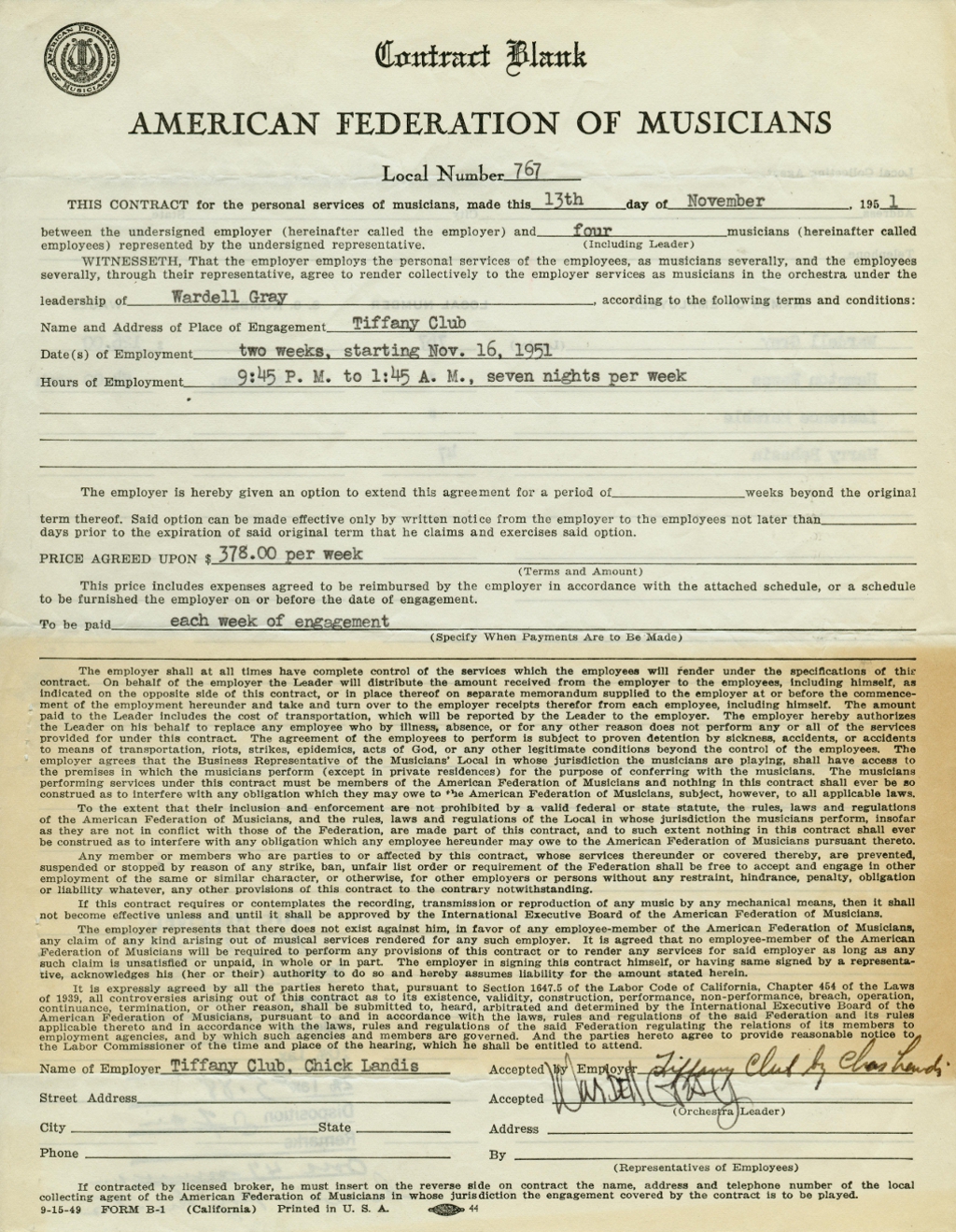 Contract for Wardell's engagement at the Tiffany Club, courtesy of Norman Saks.